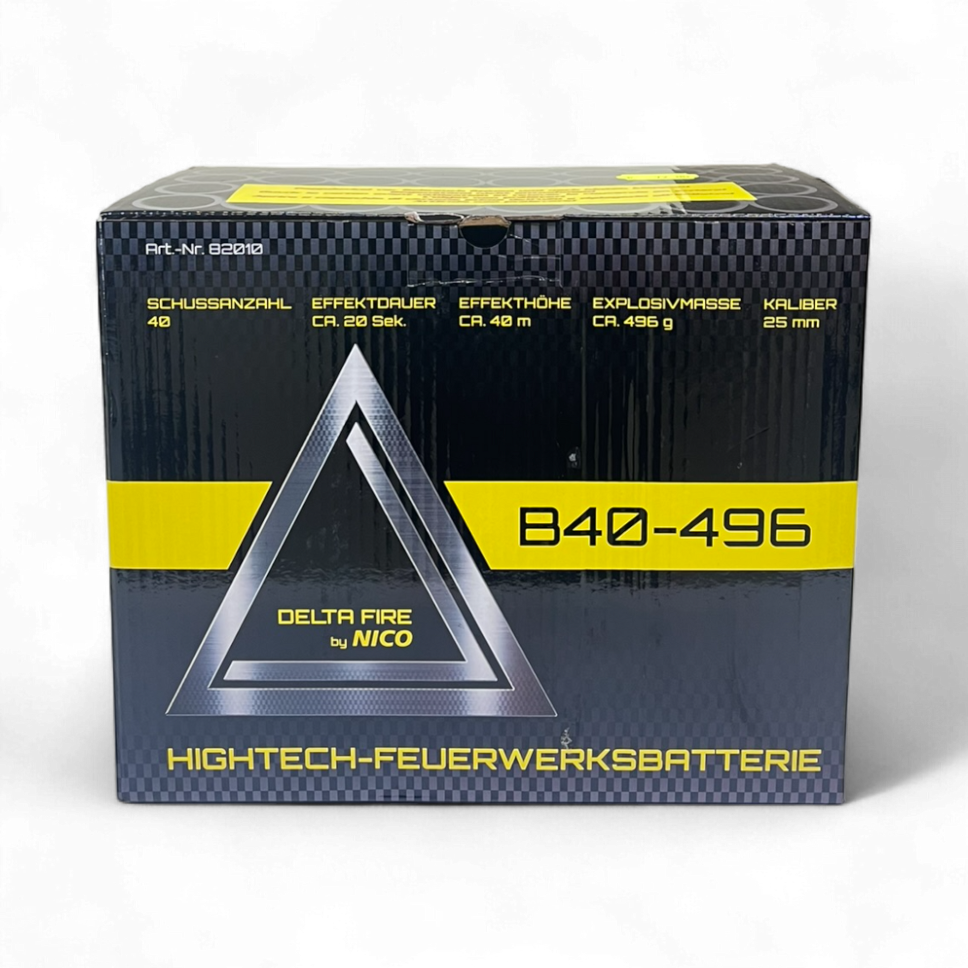 Technical details: NEM in g: 496 Duration in s: 20 Height in m: 40 Caliber in mm: 25 Number of shots: 40 Distance in m: 50 Age: 18